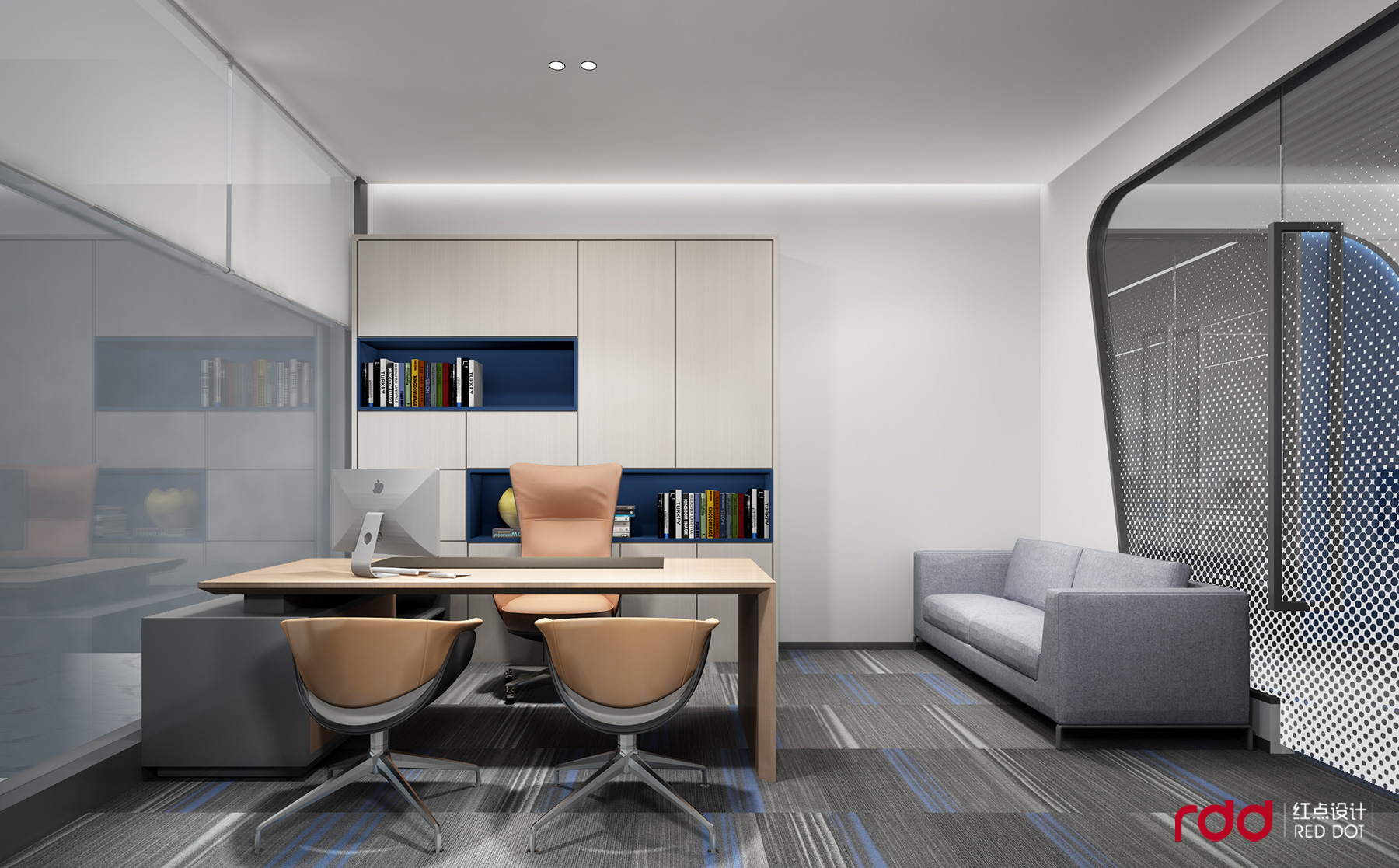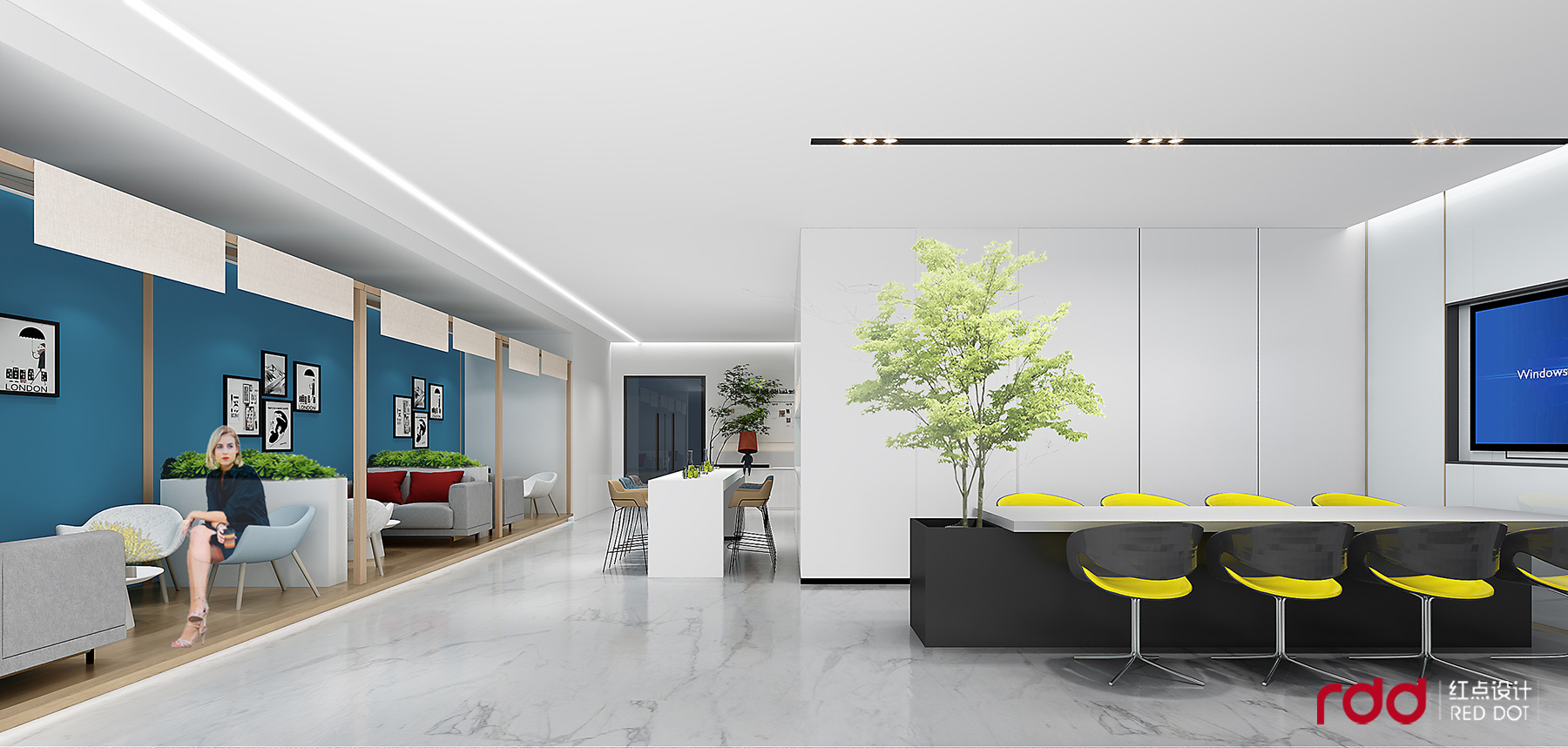 休閑區:為了突破傳統辦公區域的規整乏味,在核心區域特意設置了休閑活動區,員工可以在這里休息、研討、辦公、學習,以溫暖有活力的藍色和帶有俏皮情緒樣式的軟裝吸引員工,以有效緩解他們的情緒壓力。