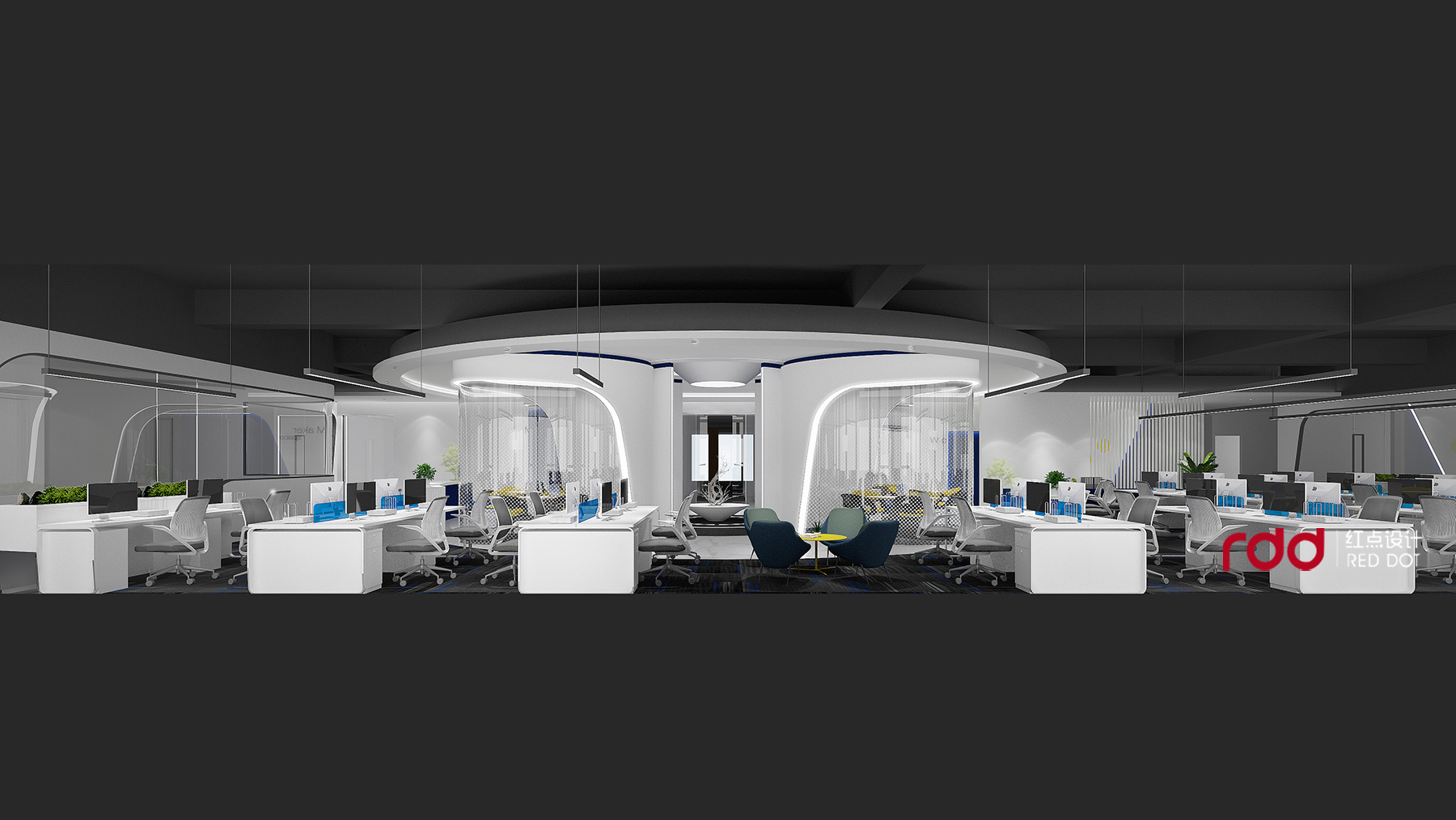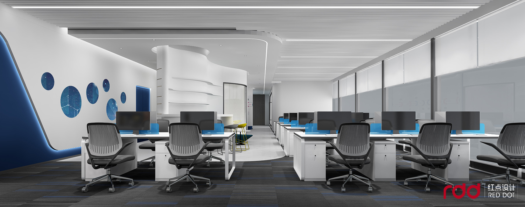 開放辦公區:采用圖形元素加上星空背景,營造了時尚創新的氛圍,促進員工的發揮無限潛能。