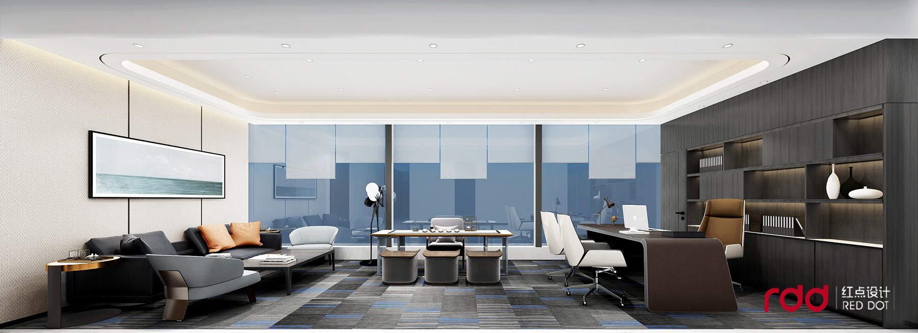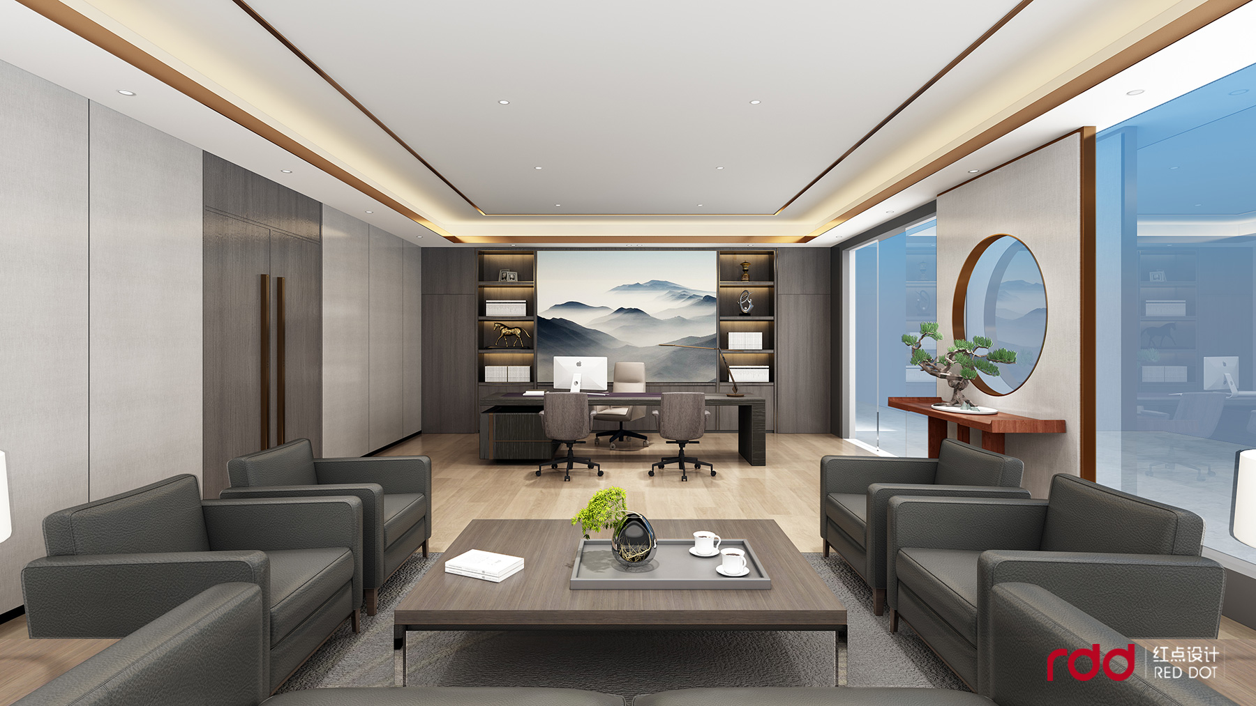 董事長辦公室采用穩重凝練的裝修風格,整個空間內沒有較大色差,造型相對保守,原有的大落地窗讓更多陽光滲透于室內,強化了空間的透明性,給人以舒適明朗的感受,呈現出完美的現代、秀逸的中式裝修。