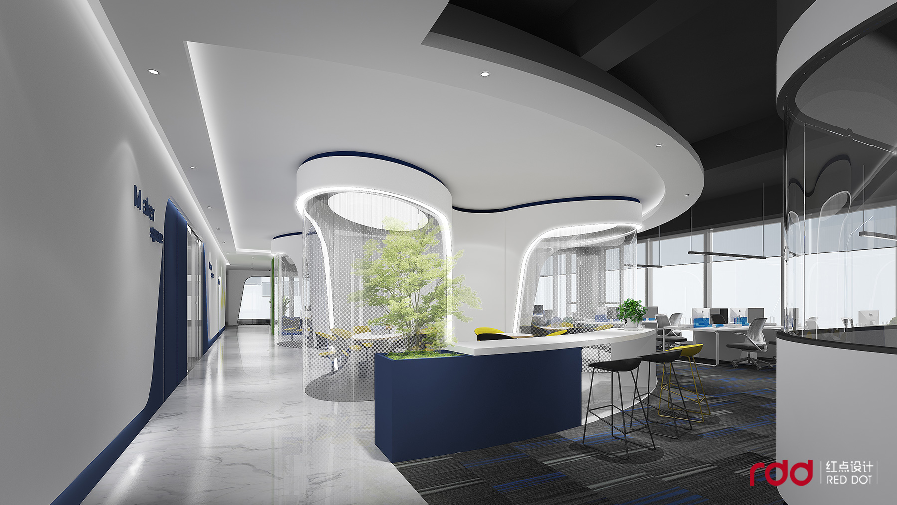 考慮到這是醫藥的一家科技企業,本案設計師以自然界“綠色、實驗、科技”的形態為靈感設計,以白色和藍色布局,干凈簡約,從家具和燈飾的選擇,再到墻面設計和地面鋪陳,靈動的各種元素蔓延整個空間,展現出曲線和不規則形態的獨特美感,營造了一個豐富、有趣、時尚的辦公環境。