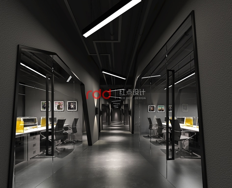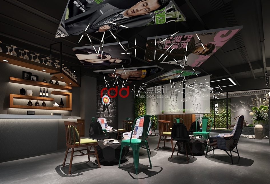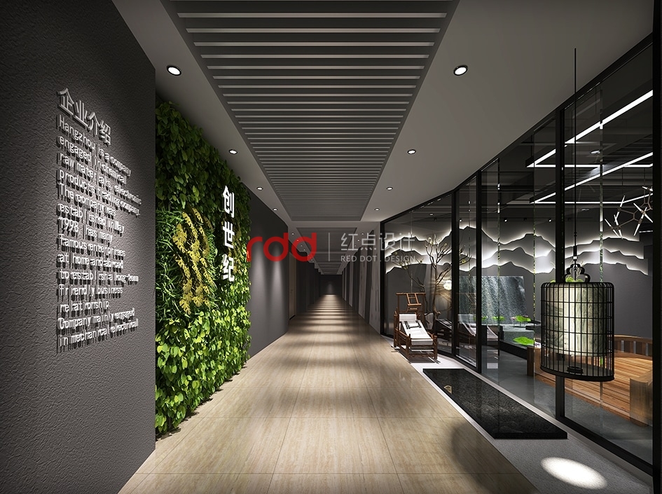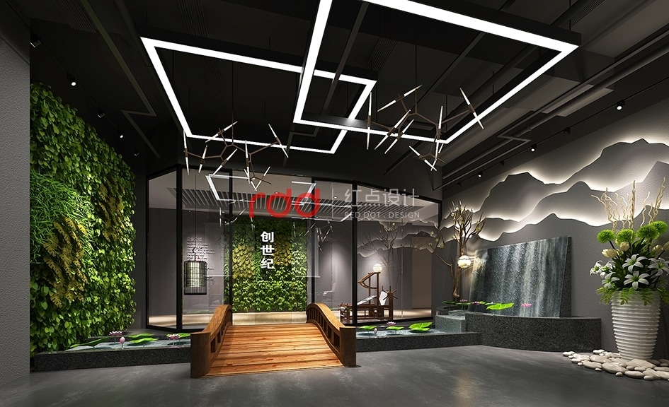 緩緩經過走廊,生機勃勃勃勃的植物墻映在眼前,加上“創世紀”的LOGO突出醒目,右手邊藝術椅子及黑色鳥籠中式吊燈給整個空間增加一點故事性。經過木橋,步入前臺區,一幅如水墨畫般的造型背景墻迎面而來,結合兩邊的荷花池及人造瀑布效果,仿佛進入“小橋流水人家”的感覺。在這樣的環境下,裸露的深灰色天花吊頂及金屬質地的異型燈更引人注目。