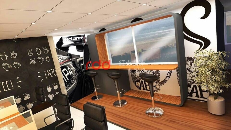 對于不同性質功能的空間,設計師以不同的主題場景為設計點,例如前臺區域以灰色為基調,通過深淺不一的灰色及線條硬朗的造型前臺,配上墻面賽車圖案,整個環境充斥著強烈的機械感及線條感。在咖啡的休閑區以咖啡為主題,原木飾面從地面一直延伸到天花,配上沉穩的黑色及咖啡圖案,做舊的黑板點餐牌,咖啡吧的感覺就活隱活現。