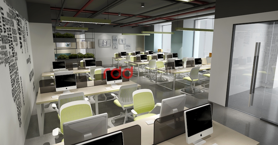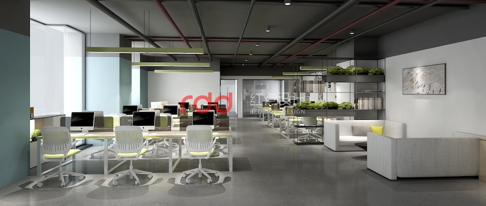 公共辦公區,以淺灰色的地膠為底色,配合嫩綠色及木色的家具,營造出輕松的辦公環境。