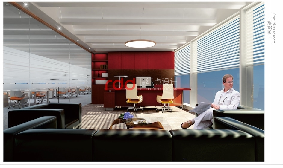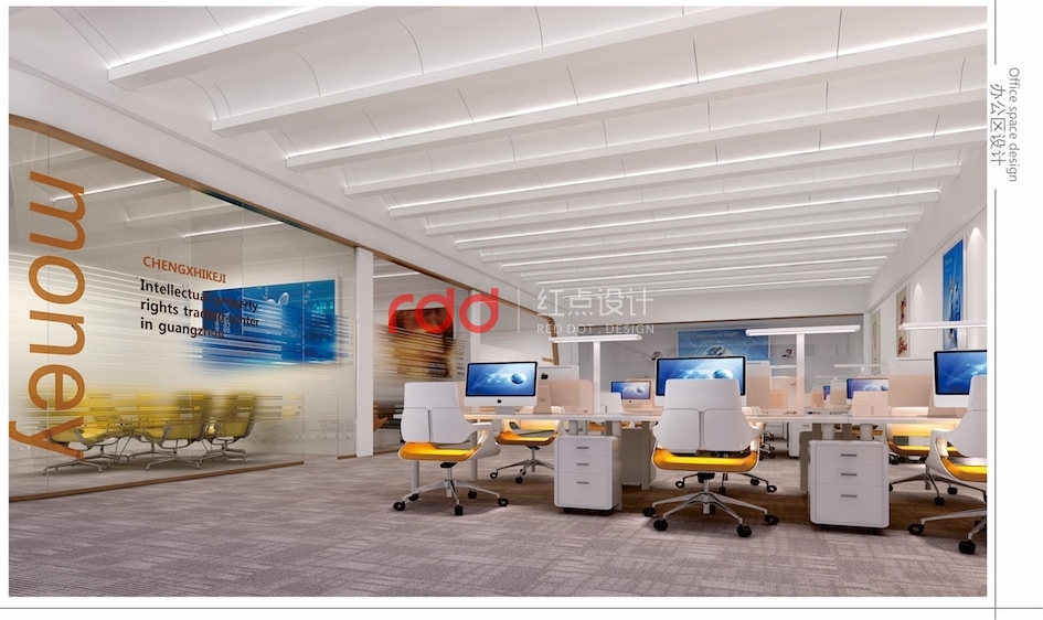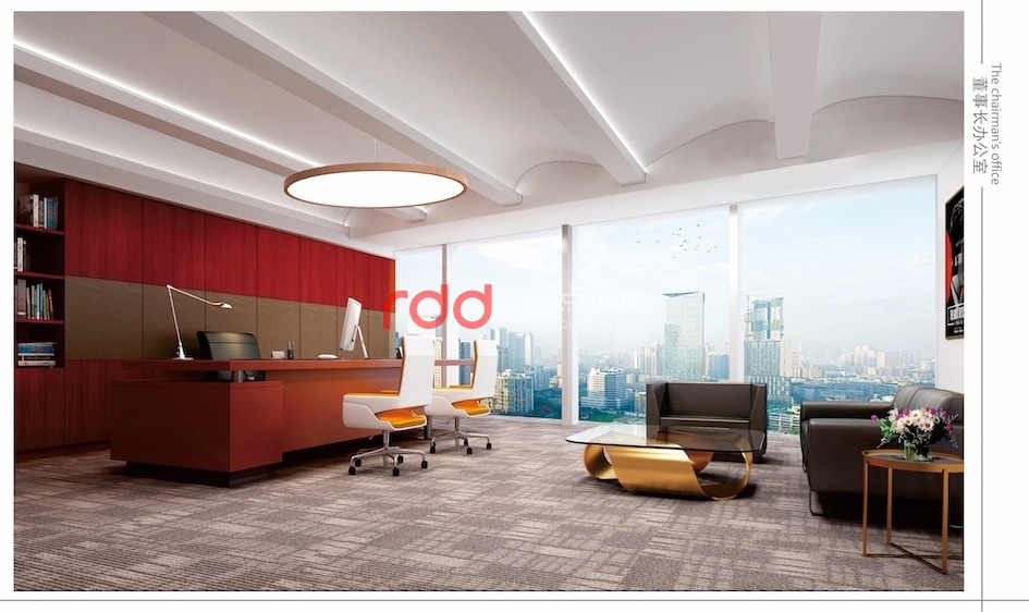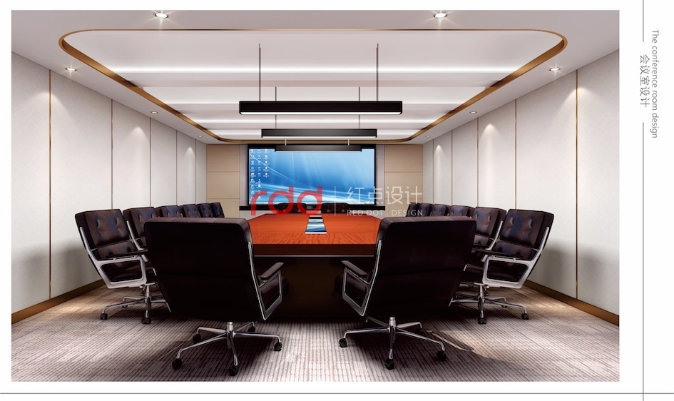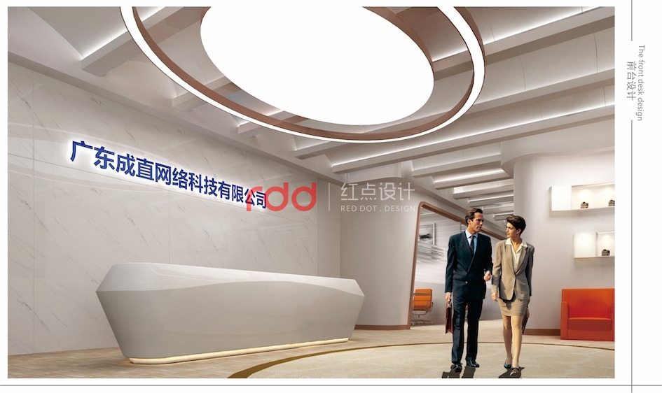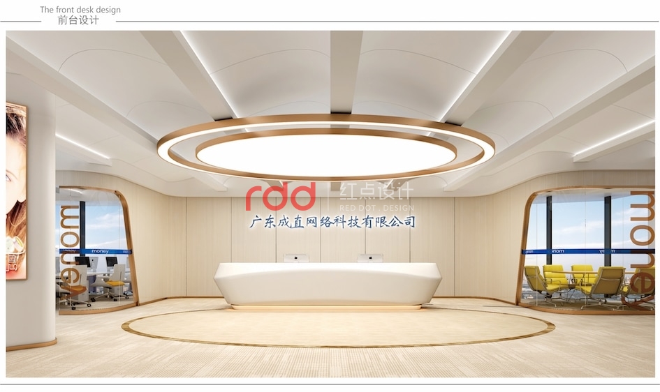 網絡科技公司在很多人概念里應該是空間科技感比較強的公司,但紅點裝飾的設計師反其道而行之。進入前臺大堂,波浪形的天花吊頂,玫瑰金包邊的雙圓形大吊燈,與地面圓形地花相互輝映。加上流線感極強的造型前臺,仿佛進入了船艙的駕駛室。