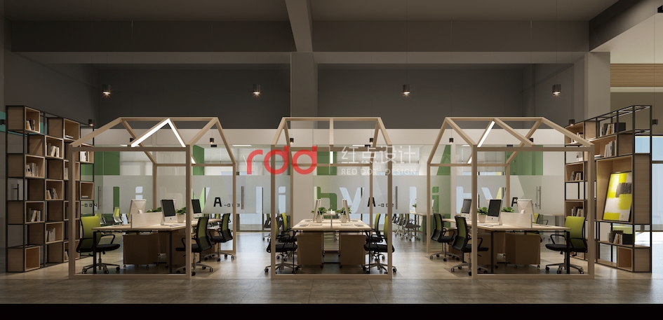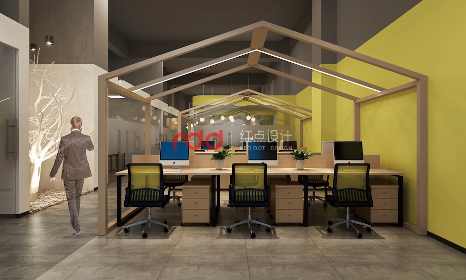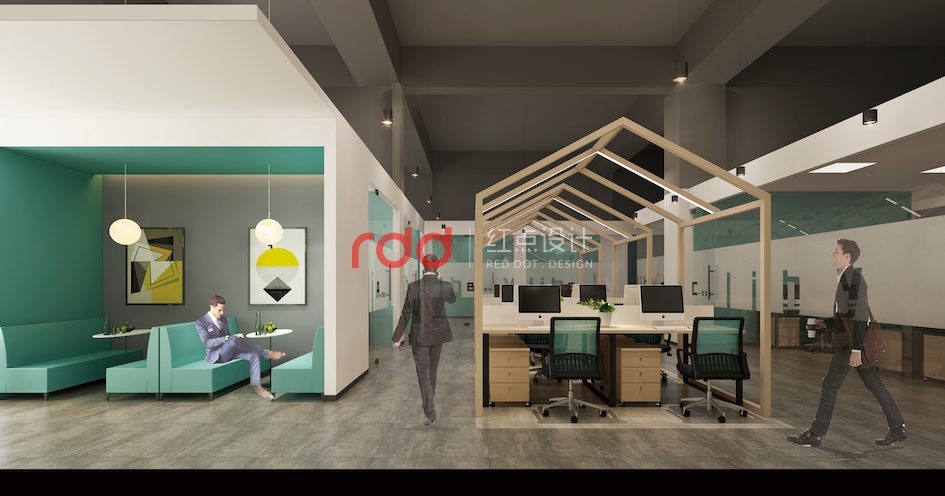共享辦公區是最活躍且最具代表性的空間。設計師在每組卡座的上方設計了一個房子的造型,仿佛是每個溫馨的小家。