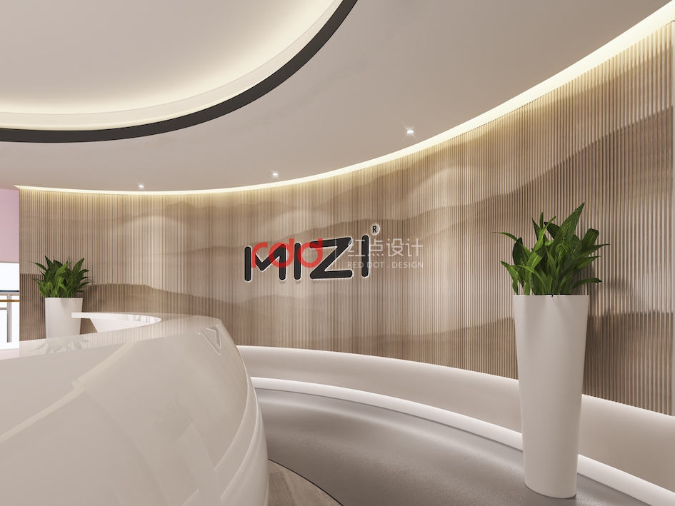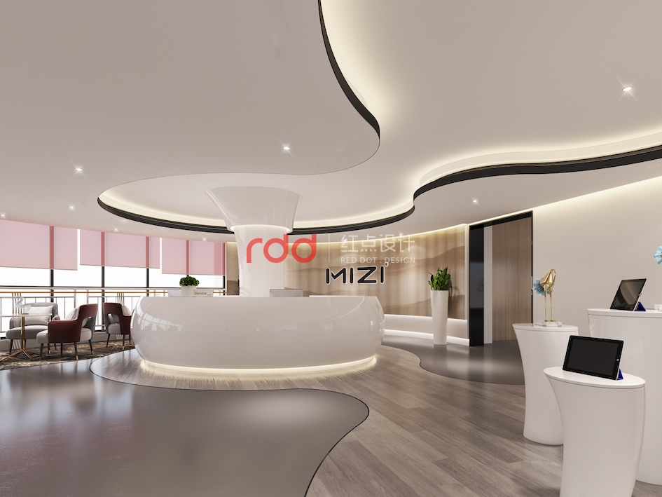 弧線是最能體現女性柔美的特征。弧形前臺的設計猶如含苞待放的少女,亭亭玉立。背景墻上“MIZI”的發光logo簡單大氣。