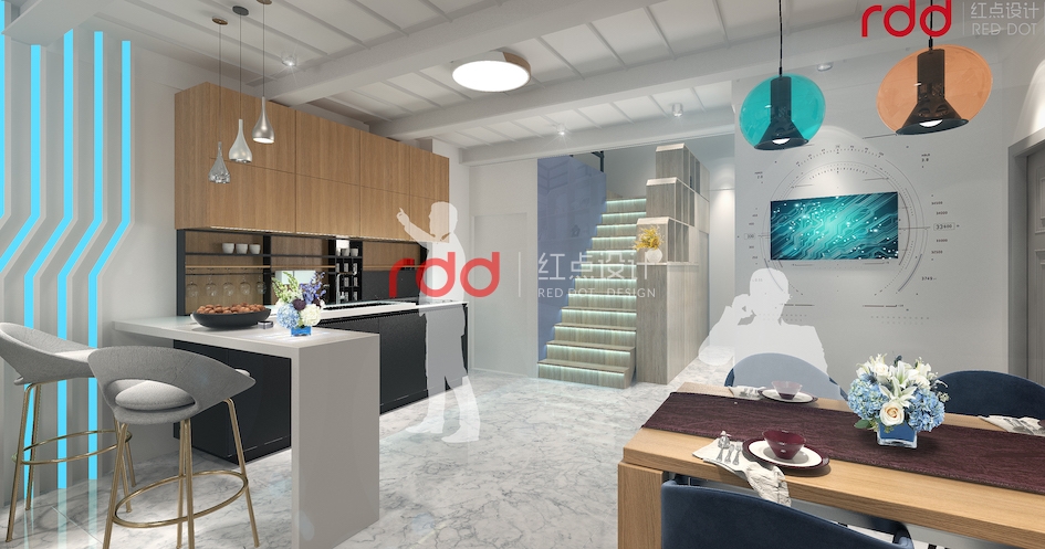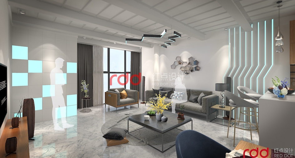 藍色強調科技、效率,表現出一種美麗、冷靜、理智、安詳與廣闊。因此在休閑和接待室,用藍色的線條、色塊來作點綴,結合燈光的效果,突出空間的科技感。