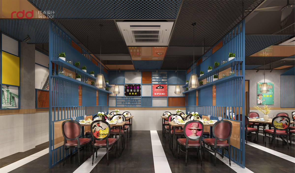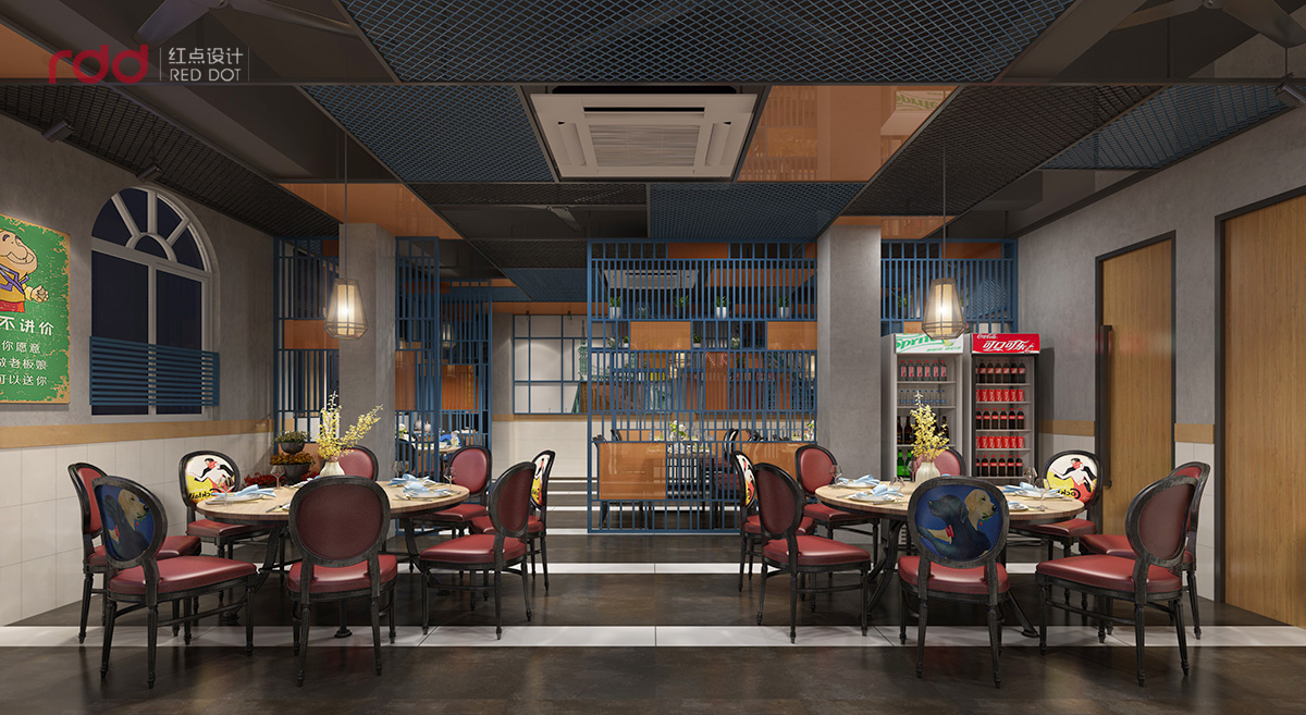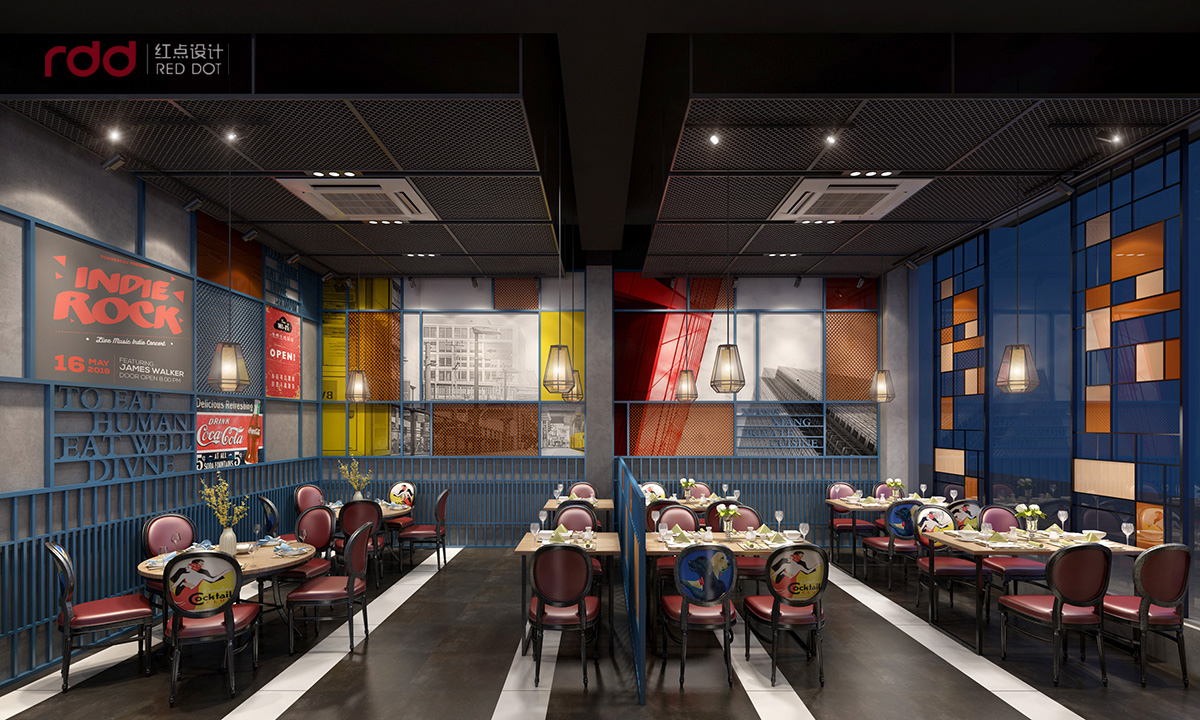 本項目的私房菜設計,紅點裝飾的設計師運用工業風與蒙德里安紅黃藍的經典構圖的的碰撞。根據蒙德里安直線與橫線的構圖原則,室內全部運用直線與橫線的穿插結構,前臺是淺色木飾面與黑色不銹鋼的搭配,加上素水泥的墻面,在暖黃的燈光下,有一種純粹而溫暖的感覺。