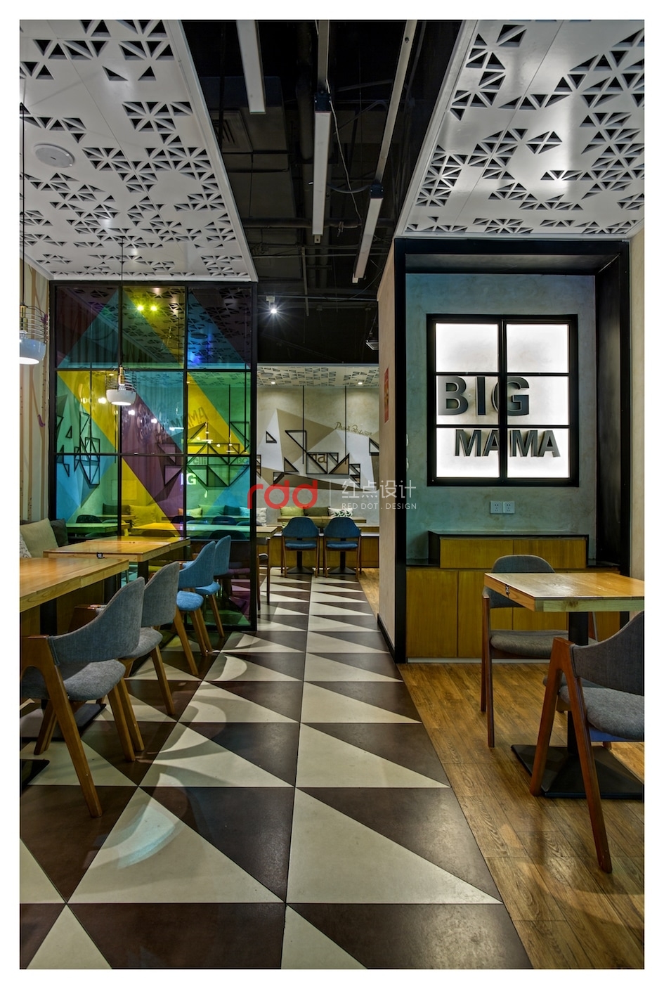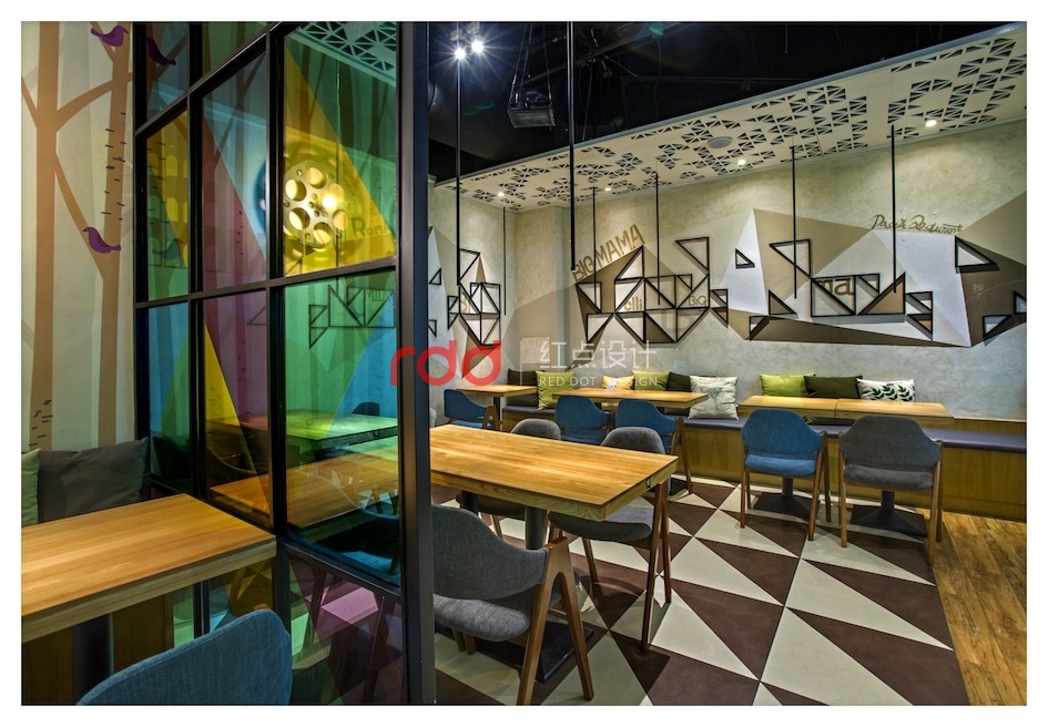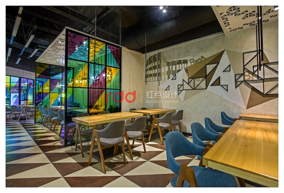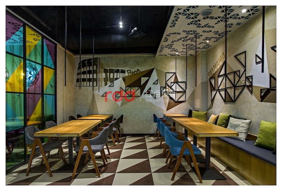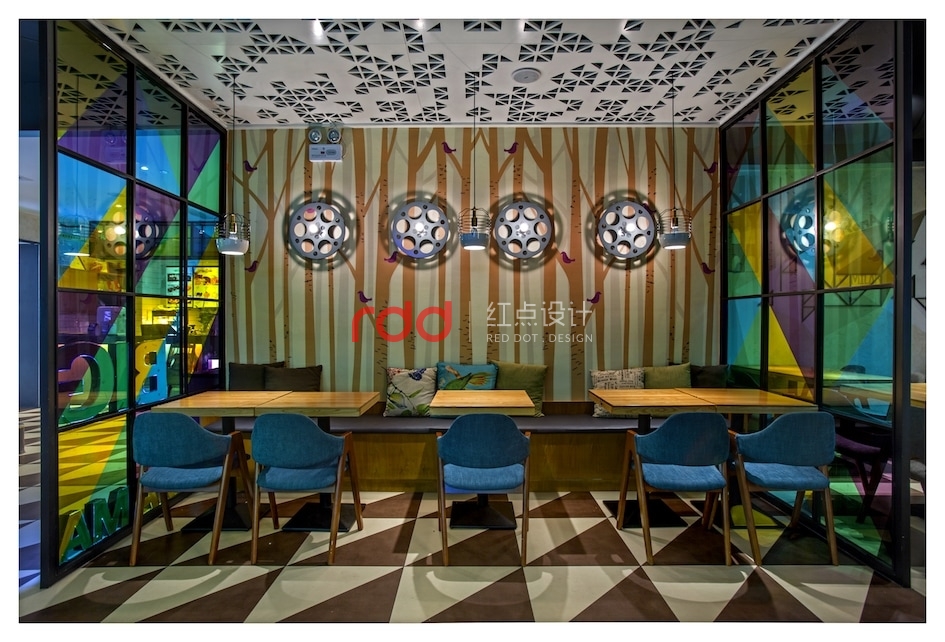幾何元素被設計師大量使用:地板、天花上隨處可見的三角形,既突破了尋常空間的方正視覺,又將俏皮與活力納入餐廳;壁燈則是別致的電影膠卷盤造型,投影在墻上恍若時光的印刻;桌面、落地窗則是矩形的代表,將絢麗多彩紛紛框進空間,形成井井有條的秩序美感;狹長的射燈遠眺仿佛一條條墨線垂天而下,讓空間縱深感十足。不得不令人感慨,設計師對于快時尚餐飲的拿捏如此到位。