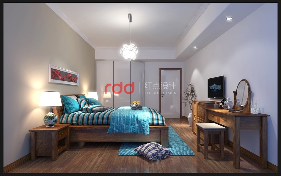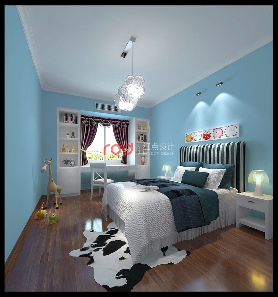 主人房木質的床,木質的家具及木地板,白色的天花和墻面,哦誒上藍色的床品及地毯,質樸的感覺仿佛回到了鄉村的休閑生活。兒童房整個空間被淺藍色的墻面包圍,是的空間顯得更加開闊。藍色條紋高背床加上白色的床品讓整個空間的明亮度提高,給人以輕快明亮的感覺,使空間整體活潑感提高。加上白色床頭柜,小巧的天使臺燈,再配上一個必不可少的兩門小衣柜和學習桌,使得學習和生活更加緊湊。