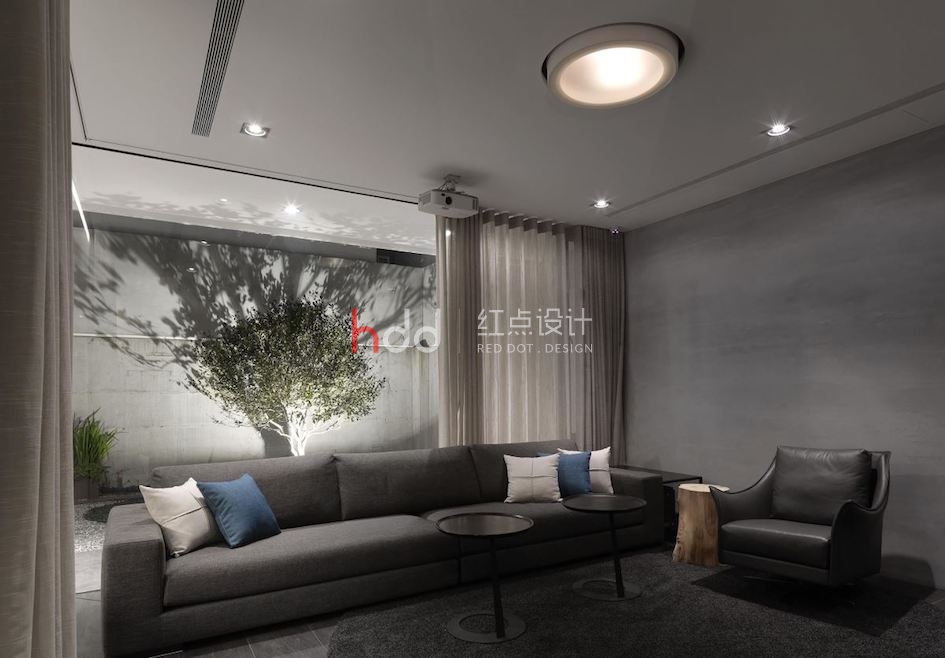 庭院外的一株單子蒲桃樹,無疑是整體一大視覺焦點,設計師加入投射燈,將樹影映照于高樓水泥墻上,展現迷人的搖曳光氛,即便是身處室內沙發區,也可借由窗戶望見搖曳扶疏的綠景與光影,締造有如畫一般的夢幻視角;辦公室空間中,則運用長型的量體延伸,導引廊道動線,搭配天花上方的極細燈帶,展現帶有工業風格的陽剛之美,同時借著開放式的柜體造型,使場域與場域之間充滿視線互動,紅色的辦公椅與綠色柜面更形成反差對比,帶出色調的活潑趣味性!辦公室內安排一座休息吧臺,位處于空間的前端,正巧可收進大門外景致,使工作同仁可在此覓得視覺與身心的放松!