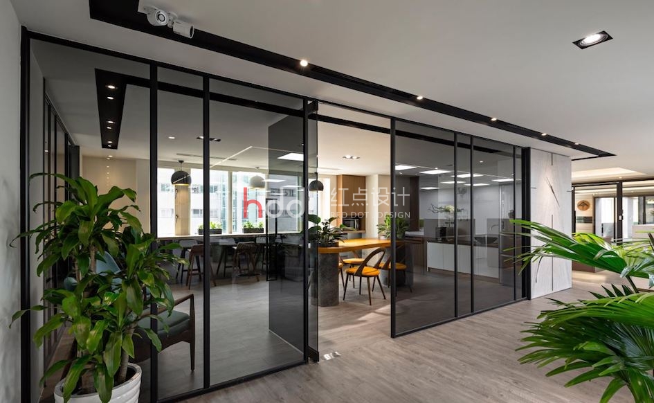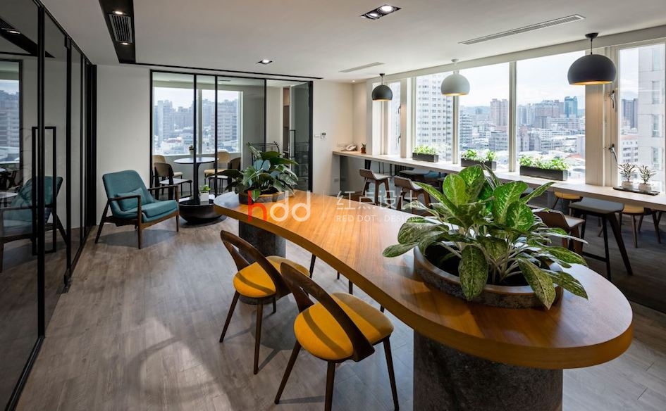 專屬辦公間內,則猶如小型版的豪宅客廳,借由辦公桌、接待區與品茗區的各自鋪排,置入豐富的使用機能,并綴上沉穩建材肌理、明亮舒適的采光效果,體現高層主管的名家氣度! 會議區兼具員工休憩主題,于靠窗處安排一整排休閑吧臺,讓員工能夠沉浸綠意、感受天空,獲得工作時的放松喘息!