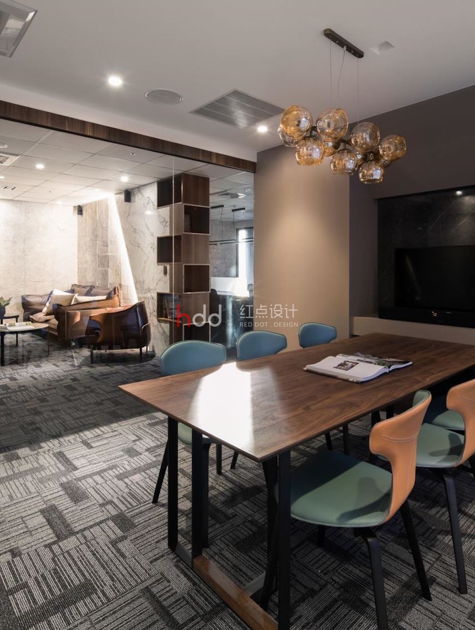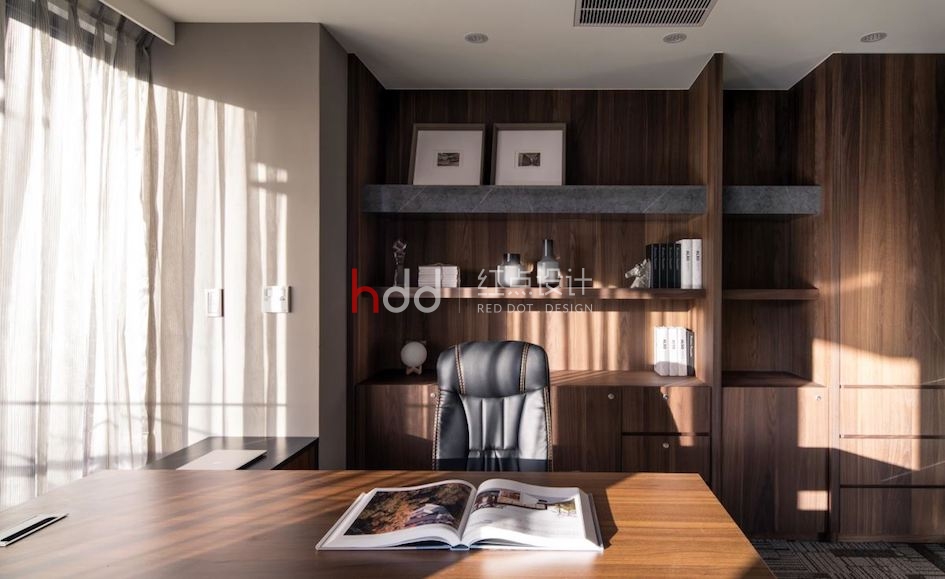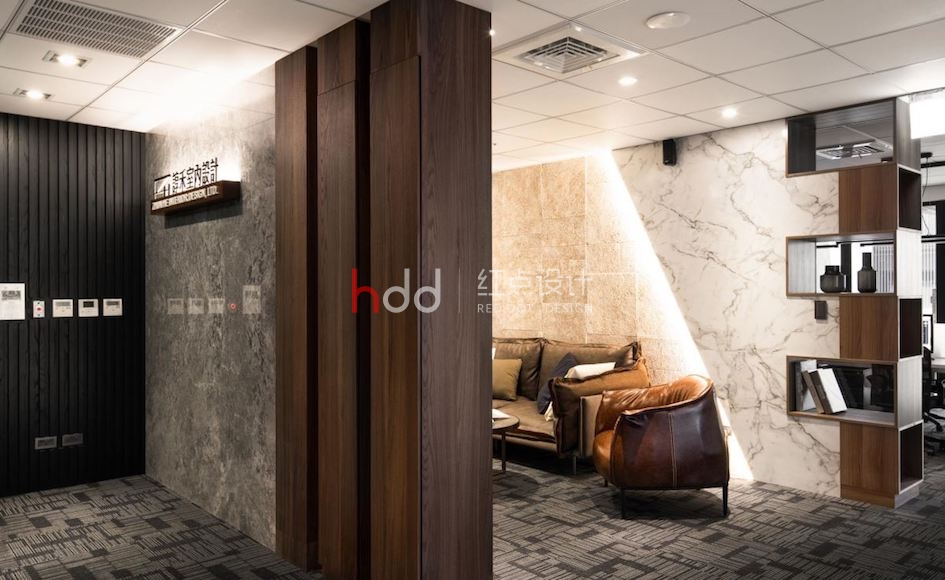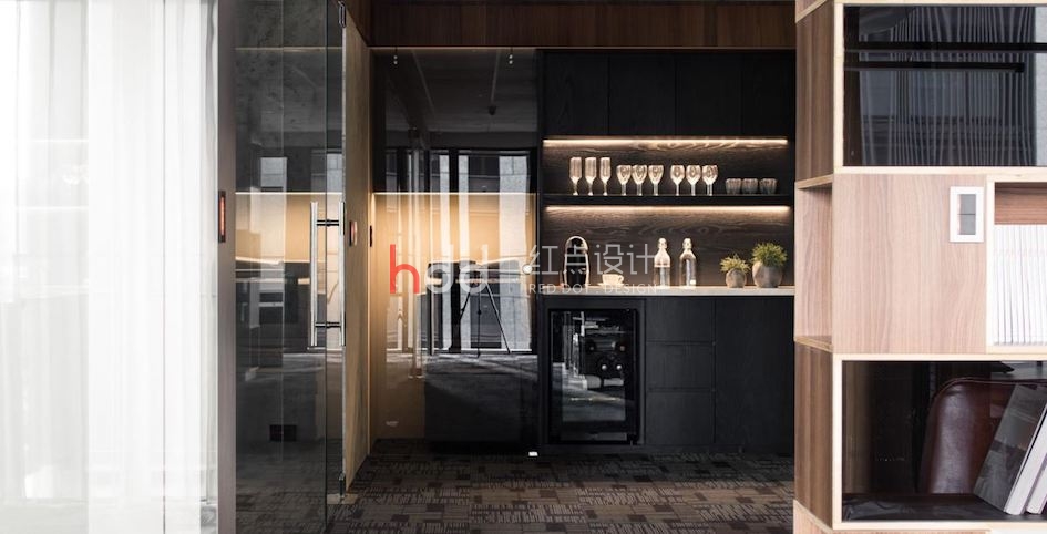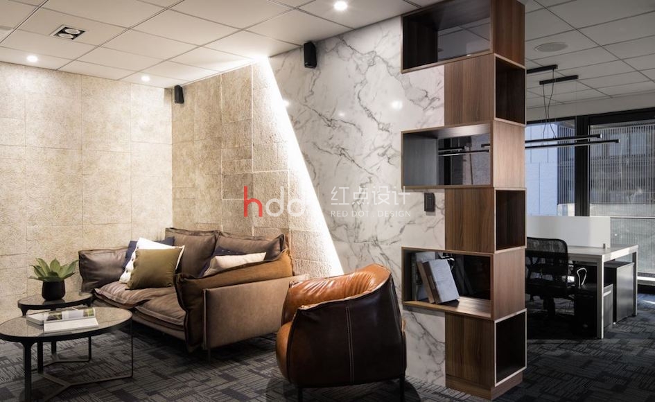 循著玄關導引入內,首先來到沙發接待區,采以灰色天然大理石打造大器立面,加上線性間接光源照射,搭配質感皮沙發的陳列,昭示都會時尚風采,并讓墻體結合展示柜功能、擺上書籍或飾品,制造廊道轉角的視覺亮點;同時使用玻璃界定領域,讓主管辦公室、會議區等各自分屬,創造領域之間的視野連貫,并促進采光的自然流動,大會議桌旁則加入整面書墻挹注機能,以細膩做工的分割線條增添設計感,且將戶外的好風景廣納入內,創造會議時的清爽氛圍! 茶水間內有別于明亮的辦公場域,刻意以黑色面板強調俐落優雅,并讓情境光源結合柜體設計,凝聚放松氣氛與時尚質感!