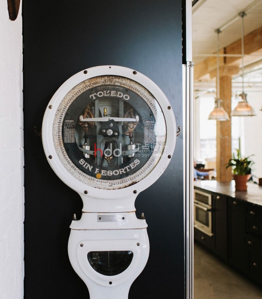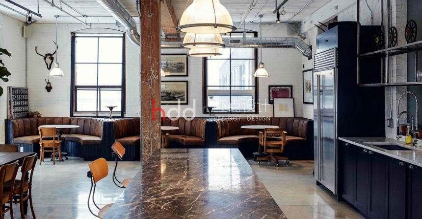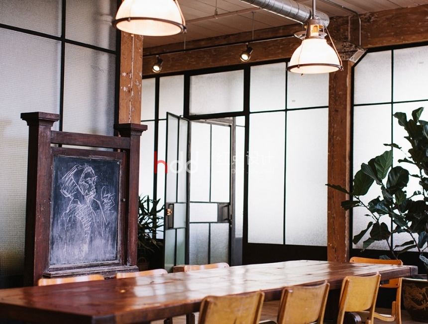 建筑內部風格保有工業時代的粗曠風格,不加以修飾的天花板,直接讓管線裸露在外,搭配上工業風的燈具,打造出獨樹一幟、卻不雕飾的舒適工作環境;地面采用木質地板,搭配上樸素材質的地毯;一旁正對著挑高的吧臺,另一角落的舒適沙發讓人忍不住坐上或小寐。