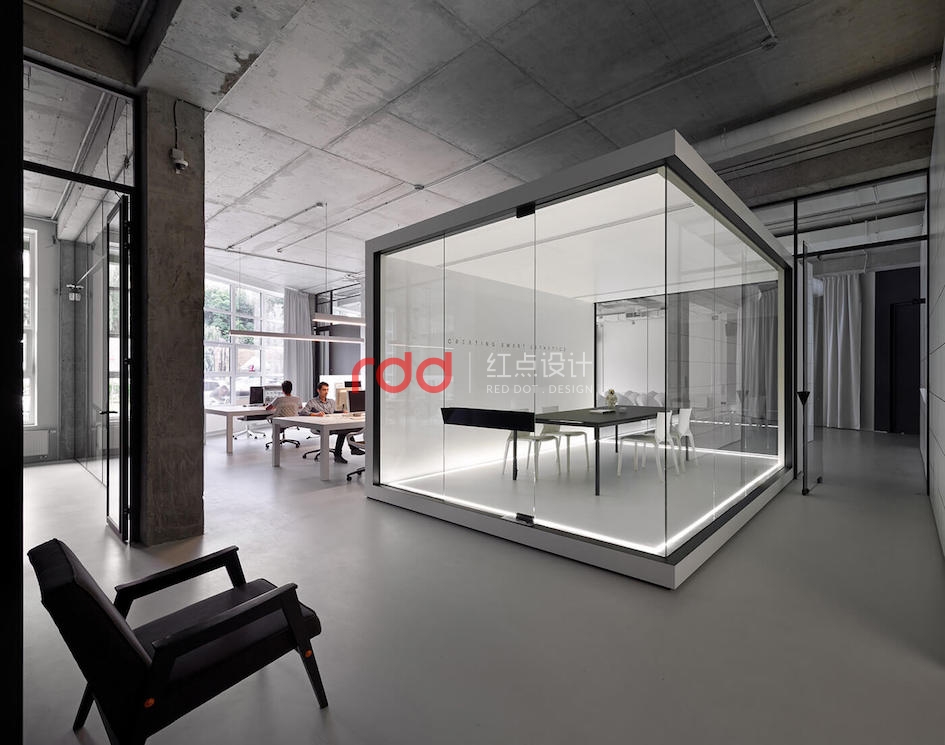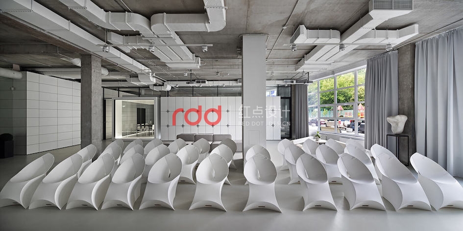 本例辦公室設計主要以空白紙張為概念。一張空白紙張,它可以轉化為一切:一幅畫,一本好書的頁面,或成為一個全新的東西。辦公室設計的中心是白色的立方會議室——兩個區域之間的通道。有一個封閉的外殼,以提供隔音。工作場所被區分為兩個白色的大島嶼,布局格外舒適。