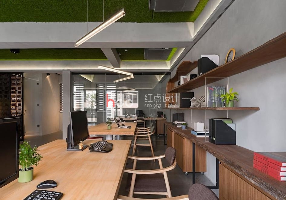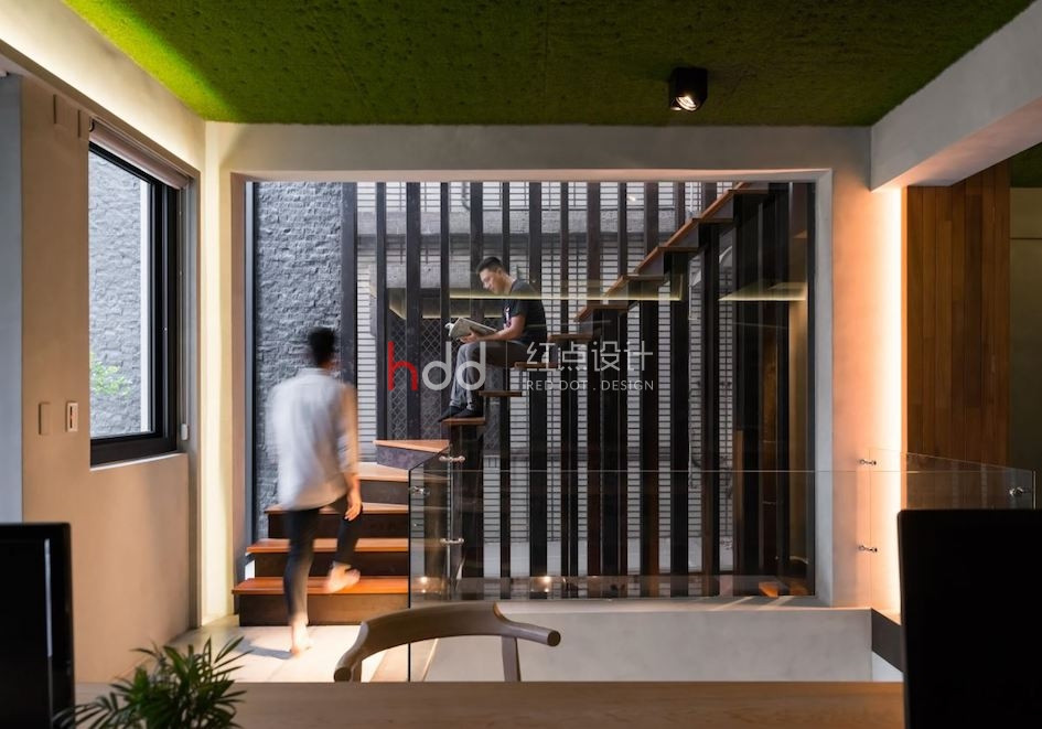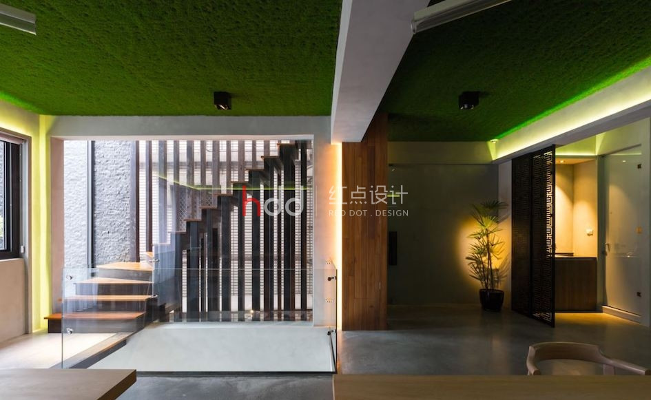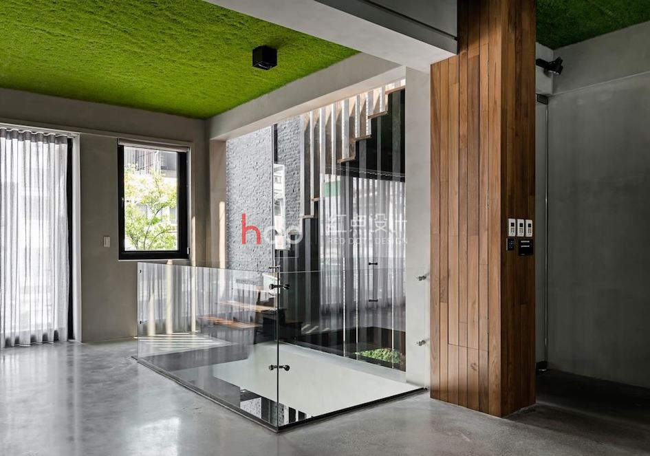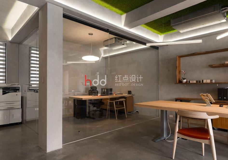 設計團隊的辦公室囊括了 3 層樓透天,每層樓皆以彰顯不同的空間機能為目的,不同于 1 樓以展示為主的現代風格, 2 樓辦公室以個性工業風為主軸。 穿越設計團隊訂制的鐵件垂直樓梯來到 2 樓空間,利用玻璃材質作為隔間,與兩幅雙面落地玻璃窗相互呼應,彰顯整棟建筑的感光度與透明感。雖然空調設備與梁體結構皆為裸露設計,設計師仍悉心透過梁間的燈光安排,佐以梁上的溝槽設計,達到修飾梁面的效果。利用天花板的綠化草皮,柔化水泥粉光地坪帶來的冷調氣息。全開放辦公室內擺放可升降的木質長桌,更能隨辦公、會議調整用途,主管辦公室採用玻璃隔間,同時保有私人空間,卻不顯過度隔閡。
