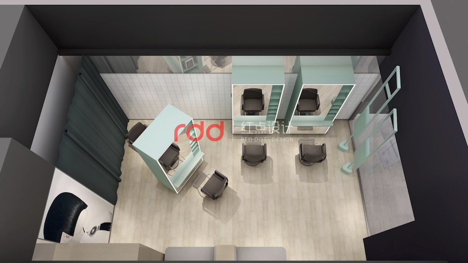 “快剪”是口紅經濟時代下的快時尚、簡文化。喜剪工坊理發店正是這種干凈環保理發模式,這個時代趨勢的產物。據Pantone發布今年的年度流行色是綠色。因此紅點裝飾設計的設計師運用馬卡龍綠為整個空間的主色調,這種顏色既符合流行趨勢也給進去剪發的顧客一種清新的感受。正符合喜剪工坊:互聯網、輕時尚、用心剪的服務理念。